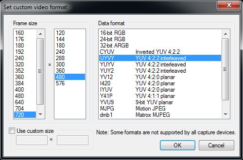 720x486 won't work. Crop away 6 lines. Note I added a bit about YUY2 to my last post.