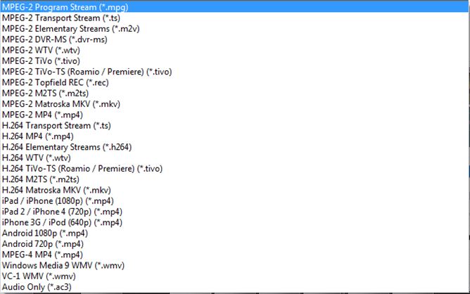 I tried MPEG-2 program stream (*.mpeg) and H.264 MP4 (*.MP4). Apparently both give the same output quality.
