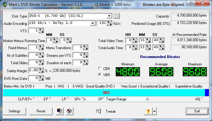 If, however, you wanted to put 3 1-hour titles on the SL disc, your equation changes to 10,800sec. This equates to a (average) bitrate of 3.3147Mbps, and for this you would want to use 2pass VBR and make the Max=9.800 (or 9.500...) and the Average=3.314 and the Min=0, or more likely (and usually more allowable) 0.5Mbps. DL average rates would be raised accordingly (no need to change max & min).