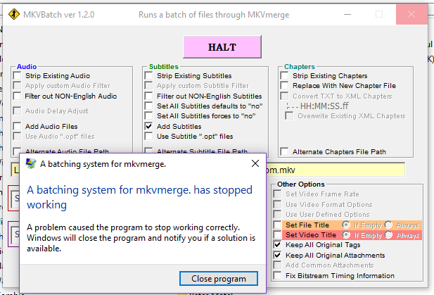 I keep getting "batch for mkvmerge stopped working " is this good?? John