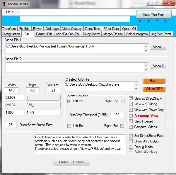 The scroll=true is necessary to display one only frame number. I have not had much luck with ffdshow avisynth and think maybe it is not updated as often. Tinestamps can also be shown by removing the pound sign commentCode:DirectShowSource(("C:\Users\Bud\Desktop\Various test Formats\Commercial HD.flv"), Pixel_Type="yuy2").Crop(0,0,-0,-0) ShowFrameNumber(scroll=true, x=10, y=27, font="Arial", size=24, text_color=$ff0000) # ShowTime(x=72, y=44, font="Arial", size=24, text_color=$ff0000) # Subtitle("Frame Rate '' Invalid for SMPTE", font="Arial", size=24, text_color=$ff0000, align=2)