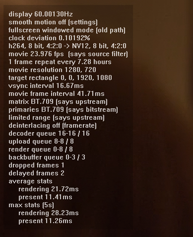 Anyhow..... if you're using MPC-HC and the MadVR renderer you can press CTRL+J while a video is playing and you'll get something like this: