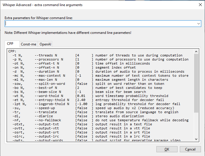I need help in something concerning the Whisper Speech to text function. I use the beta version 3.6.13 because thats what works with hungarian language. So I need help in the usage of the Whisper Advanced command tab, what command should I use to limit the maximum character length Thanks in advanceImage