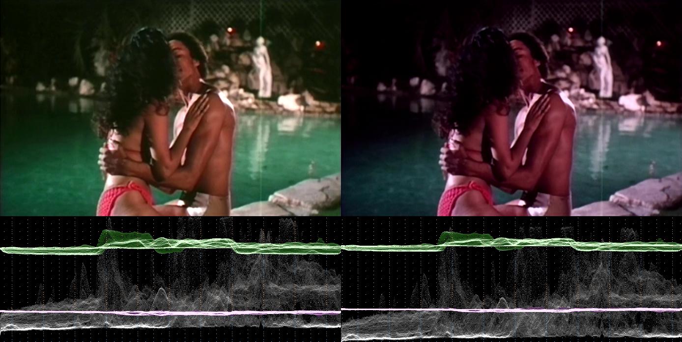 Could you please explain briefly what you did and why, i.e., what does each parameter do and how did you decide which ones to apply ? Are these all native Avisynth filters ? For other scenes (like the one by the pool), would you use the same filters with different parameters, or do something else entirely ? Is the order important, and where should QTGMC be placed in the list ? (First I suppose.) What is this histogram below each picture and how does it help to know what amount of which filter has to be applied ? From what I understand you applied different parameters for “dark” and “bright” areas, which doesn't seem possible in the ColorYUV port in Avidemux. I guess “eq2” is too rudimentary for such a tricky task, to answer one of my own questions.