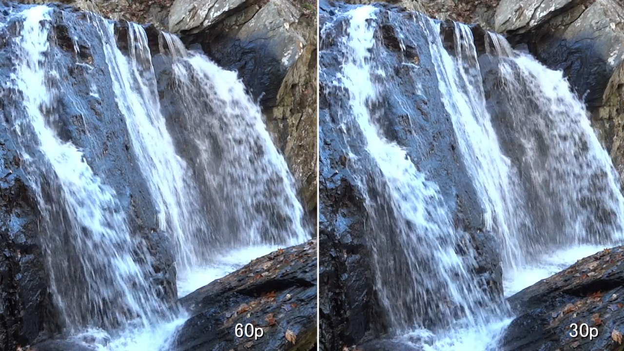 To riser-x: I looked at your footage and want to make sure I understand what I'm seeing. Attached is frame 16. I'm looking at a split-screen of a waterfall where one camera shot at 60p, then the same camera switched to 30p. I am not seeing the same motion shot by two different cameras at the same time with different frame rates. The 60p footage was then converted to 30p using a process described by poisondeathray. Correct?