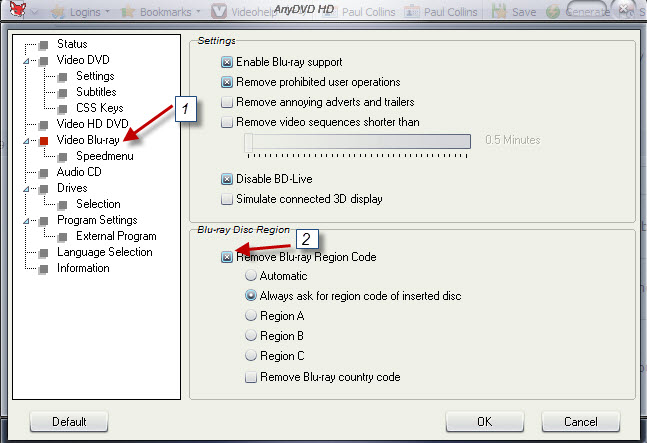 click on the Anydvd hd fox in your system tray or click on the shortcut on the desktop if you have one,A window will open like the one below, select video blu-ray (1) then make sure "Remove Blu ray region code" is checked (2)