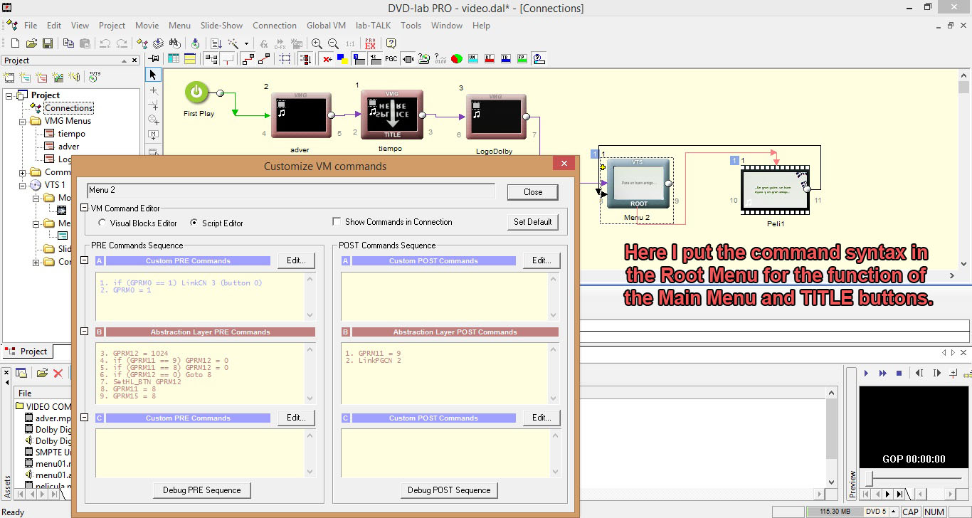 11. I used syntax from PGCEdit, I mentioned that, you can use whatever correct syntax there should be used within DVDLab Pro. I found that very cumbersome to write codes in DVDLABPro. So I just create whatever there must be created or it is easy, and then I fill it in in PGCEDit. PGCEdit write correct syntax for codes for you, you do not have to remember those exact codes, you just fill out their wizard on screen for any possible command. To try to write codes in DVDLAB directly is very difficult and cumbersome and you suppose to know those command in the first place. Very unintuitive. PGCEdit is THE tool for that.
