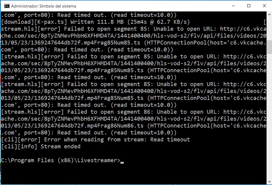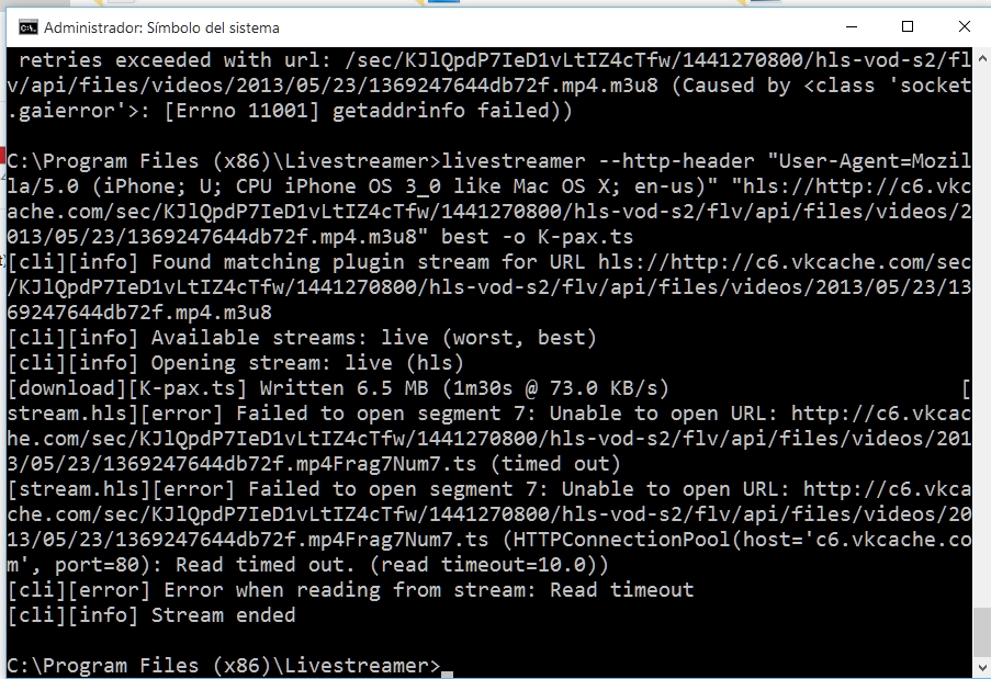 Code:livestreamer --http-header "User-Agent=Mozilla/5.0 (iPhone; U; CPU iPhone OS 3_0 like Mac OS X; en-us)" "hls://http://c6.vkcache.com/sec/2DNqb3vvExHisA5pW8Vxcw/1441206000/hls-vod-s2/flv/api/files/videos/2013/05/23/1369247644db72f.mp4.m3u8" best -o K-pax.ts