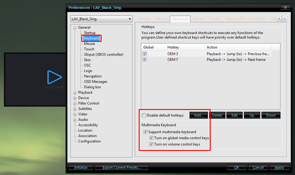 then check "Support Multimedia Keyboard", also check "Turn on Global Controlkeys",