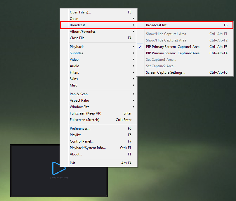 Googling for PP probs can be pretty frustrating, cause Menu/Navigation, default settings, features and what not changes constantly with new versions, at times pretty drastically.I googled "potplayer broadcast" and saw that there in option in general settings to disable broadcast option.