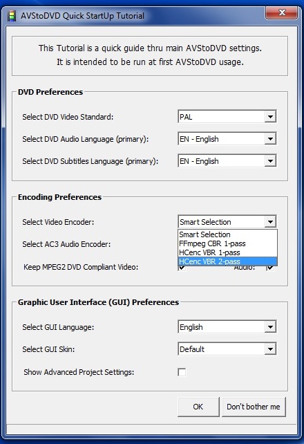 Thank you very much for your help I really appreciate it, I have downloaded AVStoDVD and seems to be successfully working, as long as I'm doing it correctly!, I am using all defaults, the only thing I have changed is the very first time the programme opened it showed a preference box in which the one and only think I changed was to "encoding HCenc VBR 2 pass", as seen in the screenshot I attached, this is the only thing I have changed from defaults, is that all correct?