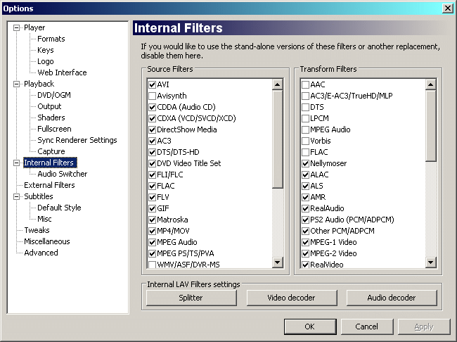 what are transform filters and source filters? i see them in k-lite codec pack mega under options > internal filters