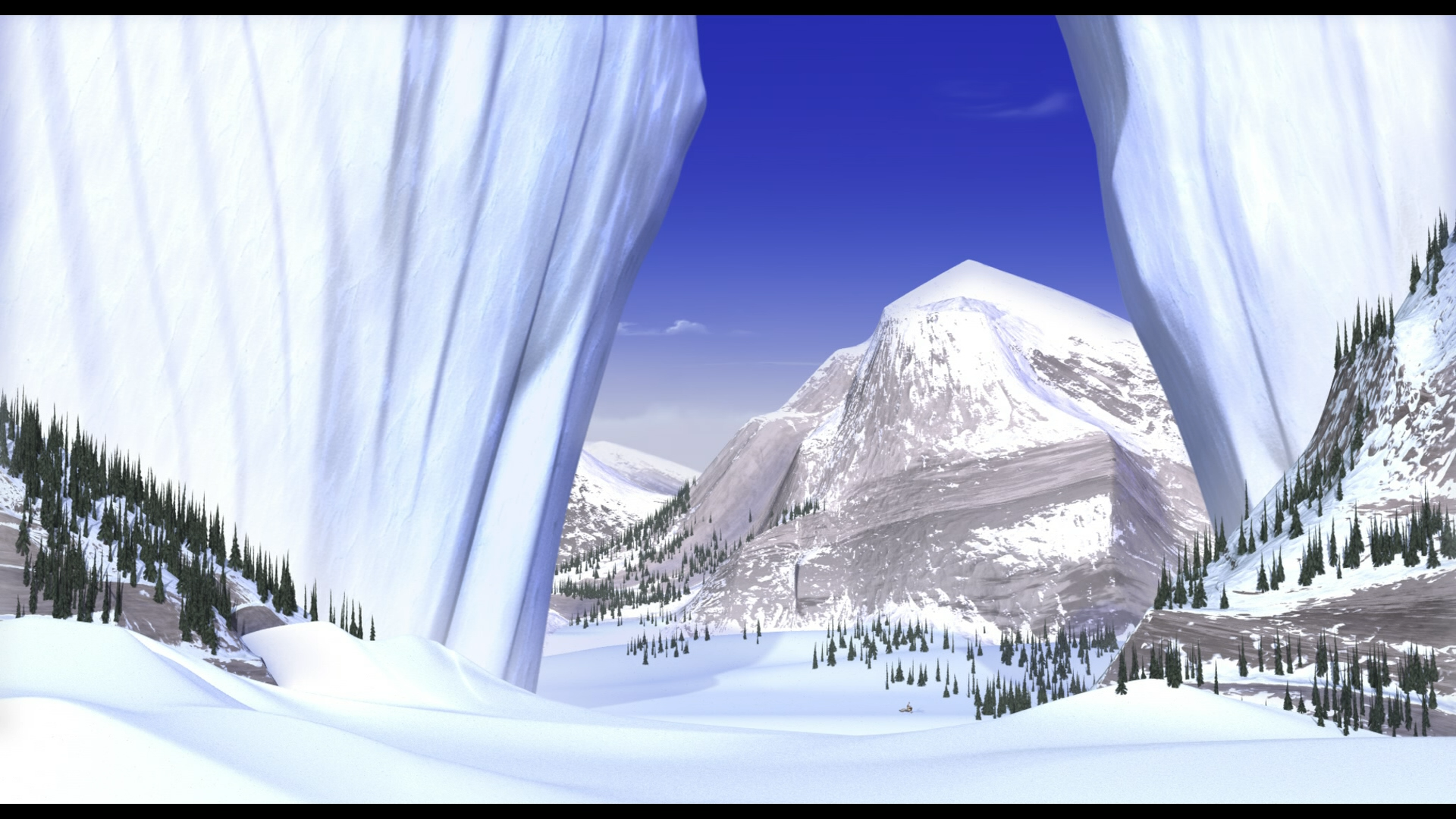Do you agree that the 720p frame is markedly worse in the areas of the frame where there is fine detail to begin with? The treetops that are only a couple pixels wide get blended into one another, as do the delineations between the mountain's rocky surface and the snowcap. The tiny character's gaping lower jaw is faintly visible in the original, but I can't make it out in the downsize.