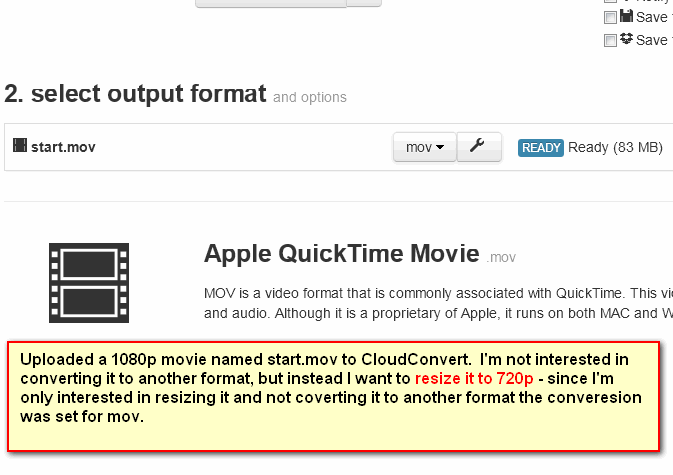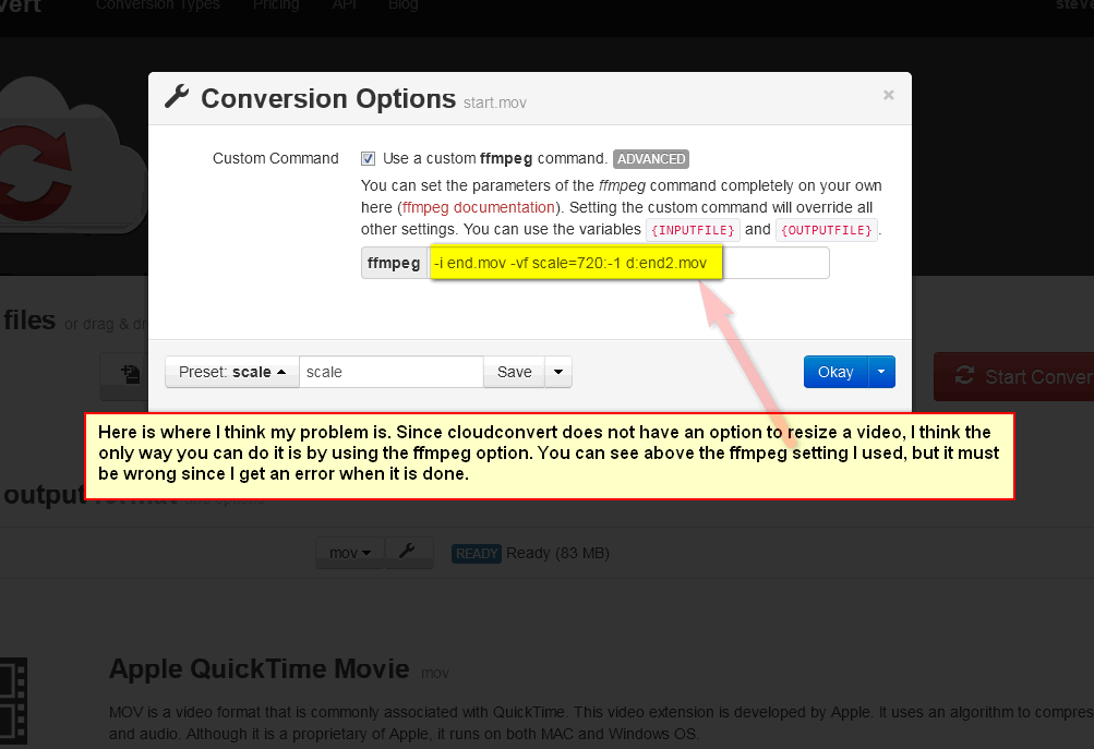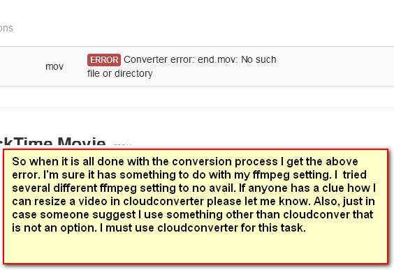 From reading the cloudconvert documentation it seems the only way to resize a video is to use ffmpeg. I tried to do so (see 2nd image below) but when I go though the conversion process I get an error (see 3rd image below). I'm trying to resize a 1080p video to 720p