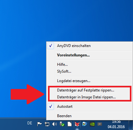 19. Taskleiste unten rechts roter Fuchs rechts klick Datenträger auf Festplatte rippen oder Image datei