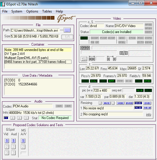 Hi Al, i have attached the 5 second clip as requested. If it help virtual dub also plays the sound fine but no video. I'm guessing video data exists by the bit rate info attached to the file.