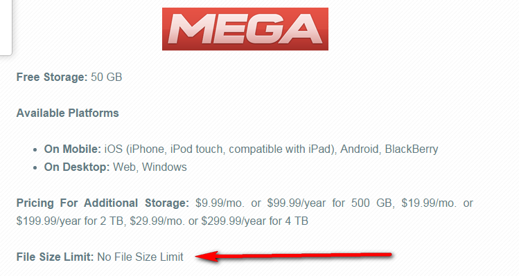 mega.nz - no file size limits, anything up to your available storage.