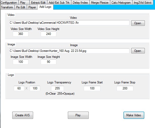 Efiste2, You can't get the picture I posted above since it is of a program I wrote and posted a month ago but since I received no feedback or interest at all, I have removed the link as it is probably worthless to others. I use it because it has all the odd stuff people wish to do and are hard to remember. It uses AVISynth and FFMpeg heavily but written so it can be adjusted to use anything that can be called as an outside program.