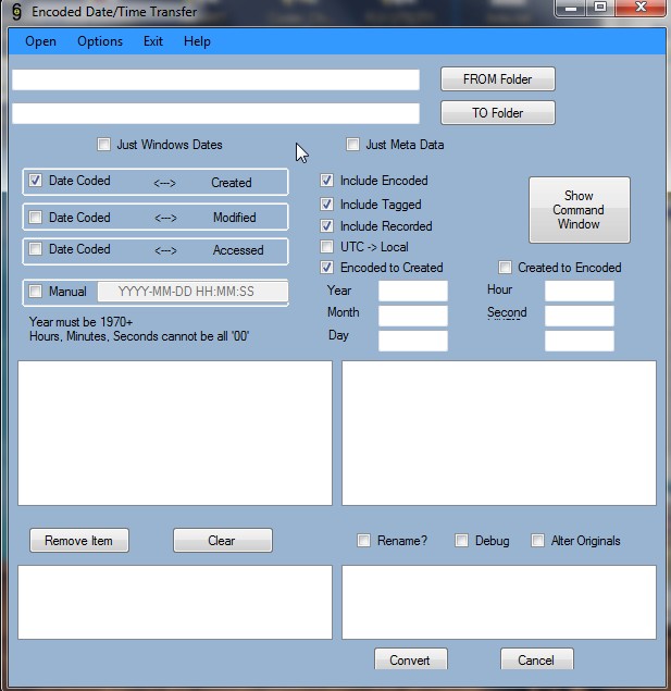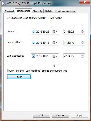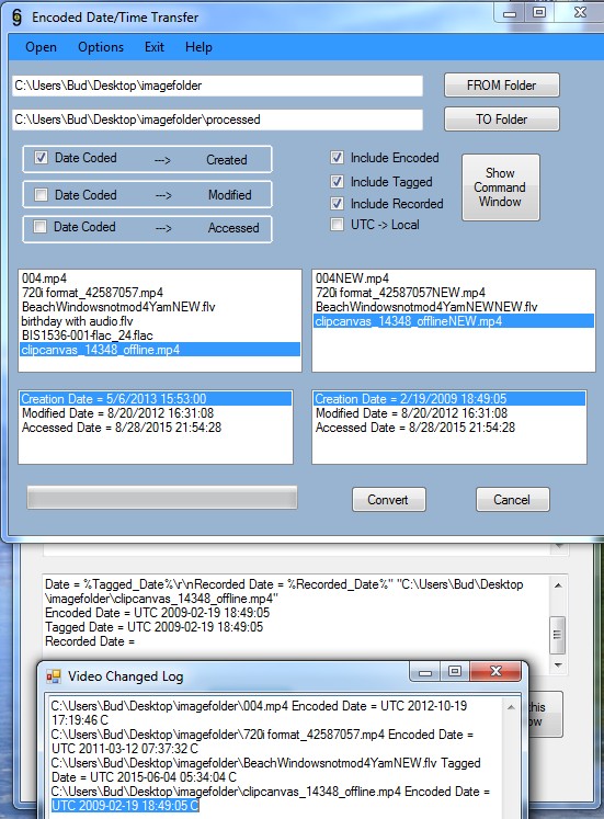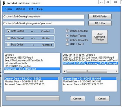 Budman1, I really appreciate your work on this little program of yours. Was delighted to come across it as I'm experiencing a problem lots of others are experiencing when loading videos to Google Photos: At the moment they're not storing the videos by their "created" or "modified" dates, and seem to be using the encoded date. On my camera (and apparently many others) this is not correctly set. So I imagine your program will be quite useful, not just for me, but many Google Photos users.