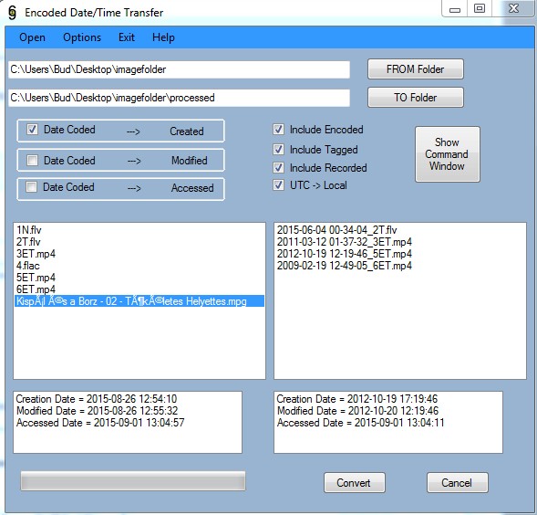 If you select "Encoded to created" then this is the function you will get. The include Encoded, include Tagged and include Recorded check boxes are because sometimes the files do not contain some or others. The program will take the first one it finds in Encoded, Tagged, Recorded order and change created or whatever you have checked on the left side.