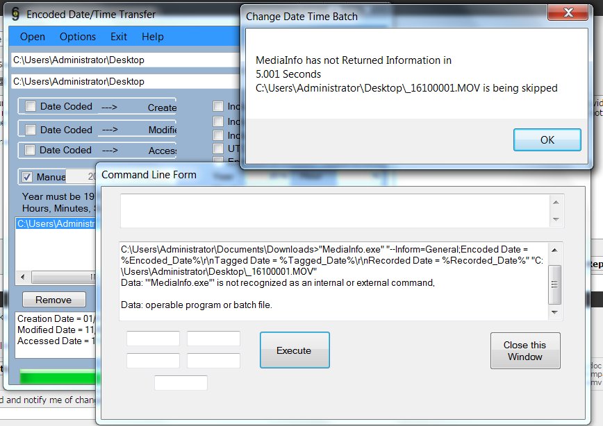 I was giving up hope, so thanks for rekindling it! I was thinking that (even if I can get it working) I'd still have to go through my >400 videos one at a time using your "manual" function. But now it's functioning, I can see that it definitely can automatically change the "encoded" value (as I wanted, but didn't know it could) - albeit only from the "created" date (which is also incorrect on all my files). Might there still possibly be a way for me to put your program to work automatically changing all my vids so that the "encoded date" matches the "date modified"?