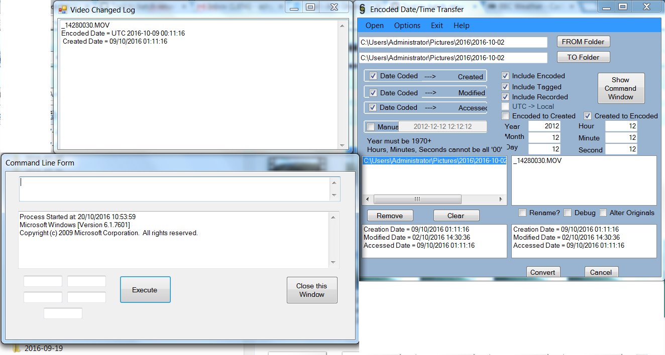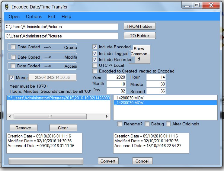 It's not every day that you have a specific problem that requires a tool that doesn't exist, and some stranger from the goodness of their heart creates that tool for you. Props to the man! Just successfully converted a large batch of files to show the correct "encoded date" so my troubles are over.