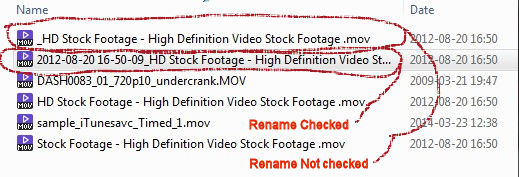 Below are my results from using HD Stock Footage... file and renaming and not. Seems I have a bug in mine during renaming since names cannot contain ":" so I changed it to use "-" instead. I will post the new version link here after it is uploaded.