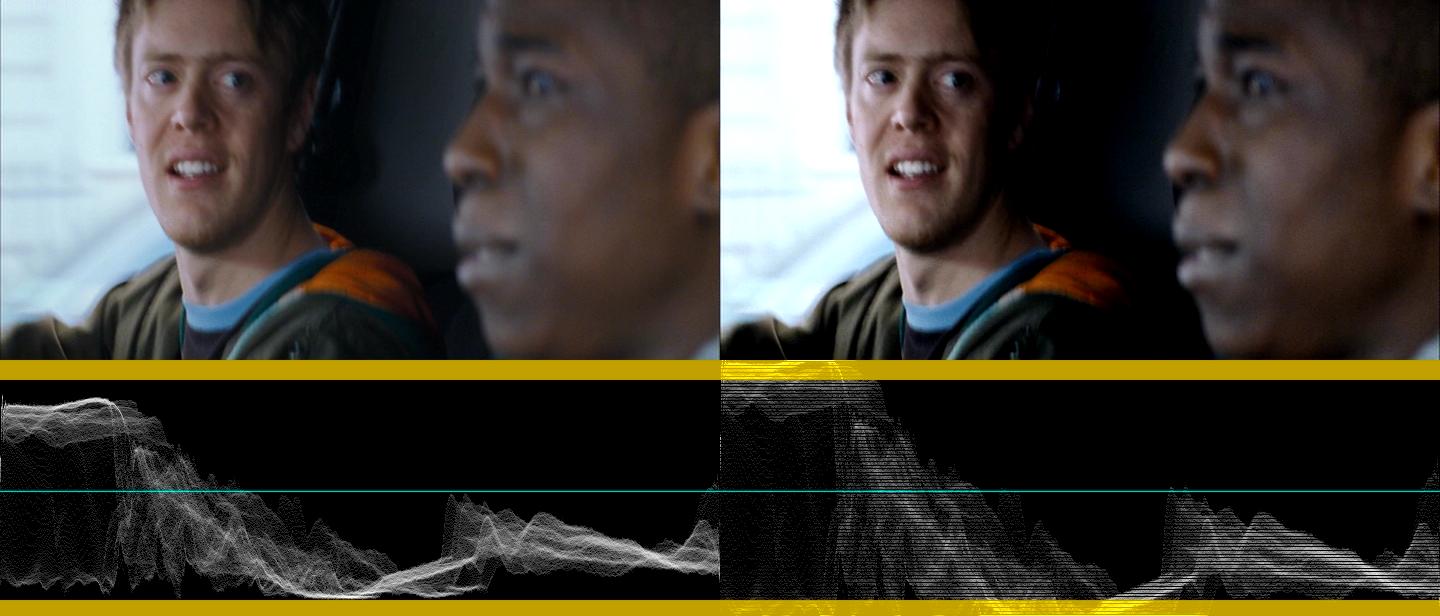 Here I'm using a slightly modified version of AviSynth's Histogram() to draw the waveform graph. It marks the areas below IRE 0 and above IRE 100 with a yellow background. At the top of the image is the picture as it would be displayed on a TV. On the left half of the image is the original DVD data. You can see that everything in the picture fits comfortably between IRE 0 and IRE 100. You can see details in the dark and bright portions of the picture. On the right I intentionally stretched the contrast so that darks fall below IRE 0 and brights fall above IRE 100 (and in fact, some are crushed at each end). Details in the dark and light areas are gone.Last edited by jagabo; 29th Aug 2015 at 11:41.