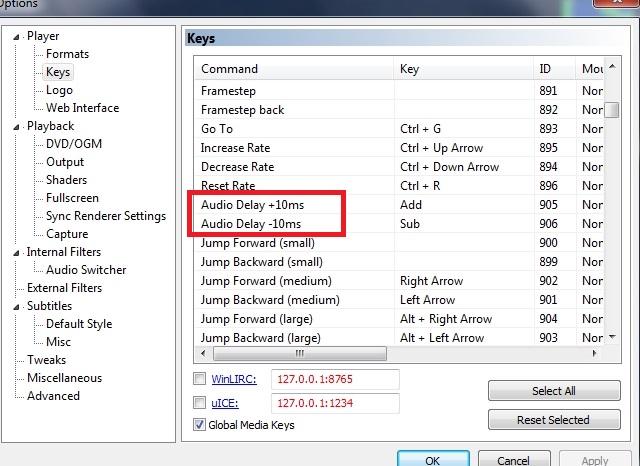 Did you (or anyone) ever find a way to do this? Optimally, I'd love to see them add the ability to have key-assignable short/medium/long audio (and subtitle) delays that you could set just like the time jumps. That way you could have, for example, 10ms/100ms/500ms. Assign keys to those, program them into your universal remote, and life would be so much easier. Whereas, currently it can take a ridiculous number of button presses to get a badly out-of-sync file corrected 10ms at a time.
