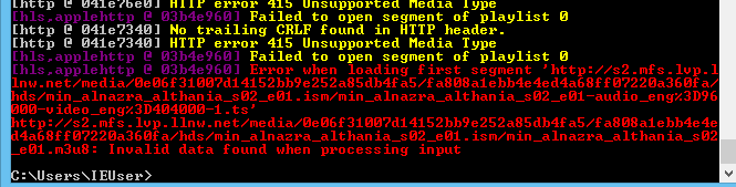 Code:ffmpeg -i "http://s2.mfs.lvp.llnw.net/media/0e06f31007d14152bb9e252a85db4fa5/fa808a1ebb4e4ed4a68ff07220a360fa/hds/min_alnazra_althania_s02_e01.ism/min_alnazra_althania_s02_e01.m3u8" -c copy file.mp4
