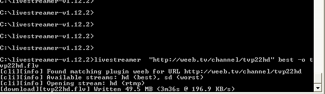 Code:livestreamer "http://weeb.tv/channel/tvp22hd" best -o tvp22hd.flv