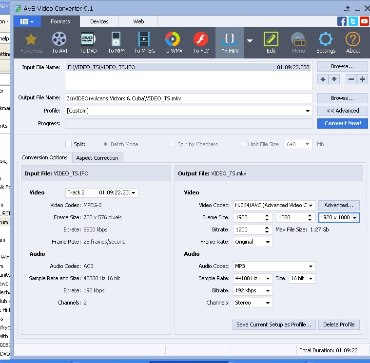 You do realize that by doing that conversion you are losing quality (both Video & Audio) in the re-encoding, and possibly enlarging the filesize (or conversely, NOT enlarging the filesize because of lower bitrate, but even further losing quality).