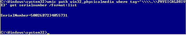 wmic path win32_physicalmedia where tag='\\\\.\\PHYSICALDRIVE0' get serialnumber /format:list