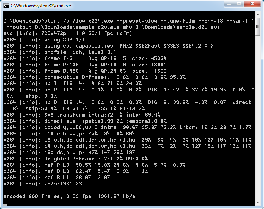 "start /b /low" starts the program at low priority so it doesn't hog up CPU time. You need to specify the full path to x264.exe if it's not in Windows' search path. I put a copy of x264.exe in C:\Windows so I don't have to specify the full path. I edit the encoding parameters to suit the particular video. You can also put the batch file in your Send To folder. Then you can right click on any AVS script and select Send To -> (name of batch file). But it's a little harder to edit the batch file in your Send To folder. This does not include audio. Pause is there so the cli windows stays open when encoding is done -- so I can see the log:Code:start /b /low x264.exe --preset=slow --tune=film --crf=18 --sar=1:1 --output %1.mkv %1 @pause >nul