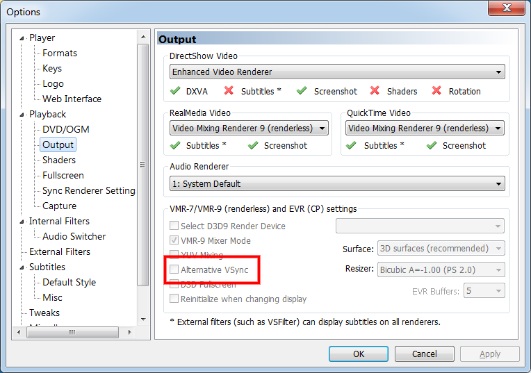 I have worked my way through that drop down list. It was set to the 'Enhanced Video Renderer (custom Presenter), the 5 features (DXVA, Subtitles, Screenshot, Shaders, Rotation) vary in availability depending on which of the options in that dropdown are selected, not sure if loss of them is important (please advise), though screenshot is why I use this program normally, all were all green ticked.