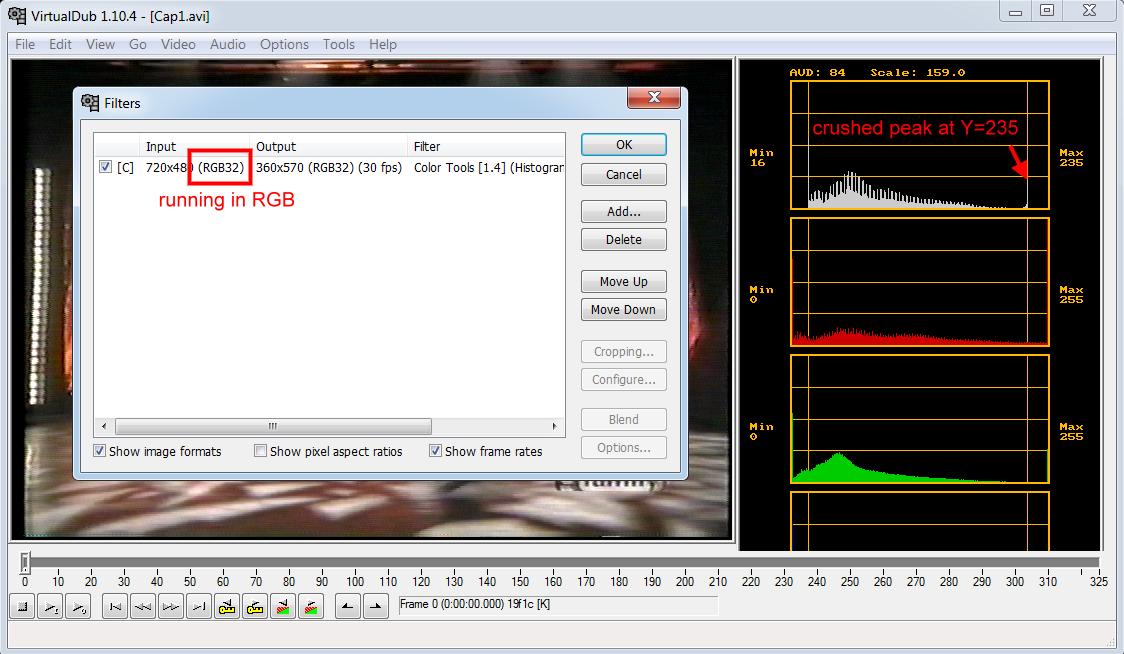 5. Used VirtualDub Color Tools to make one last adjustment to brightness & contrast. Saved result as HuffYUV.