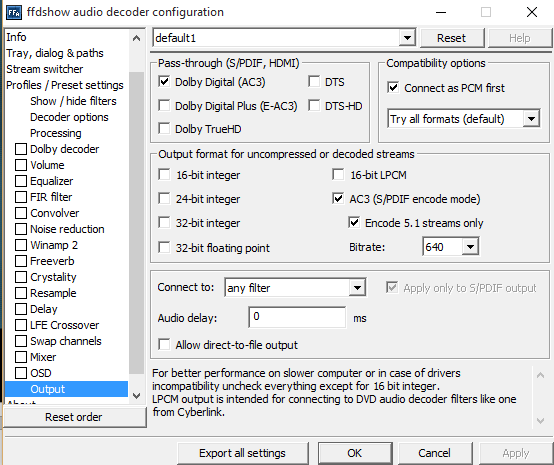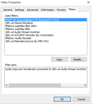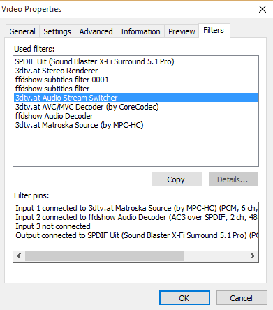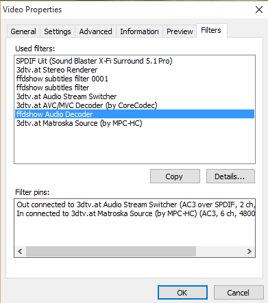 I recently got a new surround system, but this time I chose to buy a home-cinema-set instead of a speaker set. I now have my external video card connected with my blu-ray player via a SPDIF cable. I made shure that ffdshow supported 5.1 audio. FFDshow directly outputs AC3 640k audio to the bluray player. In MPC-HC the 5.1 audio playback is perfect. but when I play a video on Stereoscopic Player, FFDShow does output AC3 audio, but the player decodes it to 5.1 PCM sound, which can't be played over a SPDIF cable. it can only play 5.1 AC3 audio. Does anyone know how I can make the player stop re-decoding the audio? If you need more screenshots/information just ask!