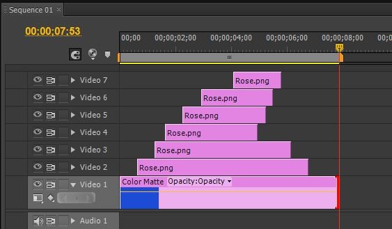 Here is a screenshot of my Premiere timeline. The Color Matte is the background and the Rose.png files are the images that pop on and off the screen. I did not add sound effects, but they could be on one audio track if they do not overlap.
