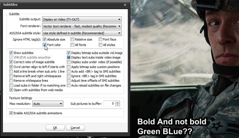 Code:1 00:00:01,459 --> 00:00:05,149 <B>Bold</B> And not bold <font color=#00FFFF> Green BLue??</font>