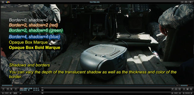 Code:[Script Info] ; This is a Sub Station Alpha v4 script. Title: VirtualDub 'subtitler' filter demonstration Original Script: ScriptType: v4.00 Collisions: Normal PlayResY: 240 PlayDepth: 0 Timer: 100.0000 [V4 Styles] Format: Name, Fontname, Fontsize, PrimaryColour, SecondaryColour, TertiaryColour, BackColour, Bold, Italic, BorderStyle, Outline, Shadow, Alignment, MarginL, MarginR, MarginV, AlphaLevel, Encoding ;Style: Foo,MS Gothic,72,65535,65280,65535,0,0,-1,1,2,4,2,30,30,30,0,128 Style: MainB,Arial,14,65535,255,0,0,0,-1,1,2,4,1,16,16,16,0,0 Style: MainT,Arial,14,65535,65280,65535,0,0,0,1,2,4,5,16,16,16,0,0 Style: Timer,Arial,14,65535,65280,65535,0,0,-1,1,2,4,5,16,16,40,0,0 Style: B0S0K,Arial,14,&HE0E0E0,65280,65535,&H000000,0,-1,1,0,0,5,16,16,40,0,0 Style: B2S2R,Arial,14,&HE0E0E0,65280,65535,&H004080,0,-1,1,2,2,5,16,16,40,0,0 Style: B2S6G,Arial,14,&HE0E0E0,65280,65535,&H408000,0,-1,1,2,6,5,16,16,40,0,0 Style: B4S4B,Arial,14,&HE0E0E0,65280,65535,&H804000,0,-1,1,4,4,5,16,16,40,0,0 Style: Karaoke,Arial,14,&H40FFFF,&HFF4040,65535,0,0,0,1,2,4,5,16,16,16,0,0 Style: ShiftJIS,MS Gothic,20,&HE0E0E0,65280,65535,0,0,0,1,2,4,5,16,16,16,0,128 Style: BoxT,Arial,14,65535,255,0,0,0,0,3,2,4,5,16,16,16,0,0 Style: BoxBold,Arial,14,65535,255,0,0,-1,0,3,2,4,5,16,16,16,0,0 [Events] Format: Marked, Start, End, Style, Name, MarginL, MarginR, MarginV, Effect, Text Dialogue: Marked=0,0:00:00.00,0:00:03.00,MainB,,0000,0000,0000,!Effect,{\q1}Shadows and borders\N\NYou can vary the depth of the translucent shadow as well as the thickness and color of the border. Dialogue: Marked=0,0:00:00.00,0:00:03.00,B0S0K,,0000,0000,0000,!Effect,Border=0, shadow=0 Dialogue: Marked=0,0:00:00.00,0:00:03.00,B2S2R,,0000,0000,0030,!Effect,Border=2, shadow=2 (red) Dialogue: Marked=0,0:00:00.00,0:00:03.00,B2S6G,,0000,0000,0060,!Effect,Border=2, shadow=6 (green) Dialogue: Marked=0,0:00:00.00,0:00:03.00,B4S4B,,0000,0000,0090,!Effect,Border=4, shadow=4 (blue) Dialogue: Marked=0,0:00:00.00,0:00:03.00,BoxT,,0000,0000,0090,!Effect,Opaque Box Marque Dialogue: Marked=0,0:00:00.00,0:00:03.00,BoxBold,,0000,0000,0090,!Effect,Opaque Box Bold Marque
