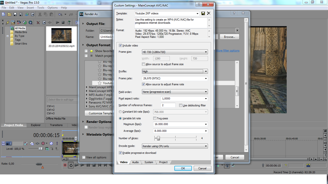 And these are the project settings and the rendering settings used on Sony Vegas