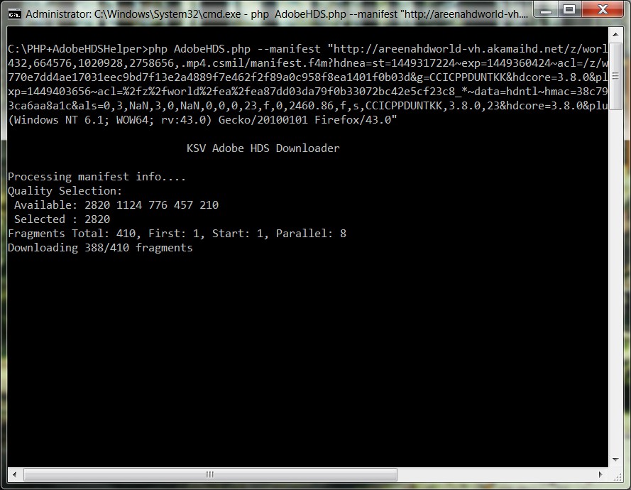 Code:php AdobeHDS.php --manifest "http://areenahdworld-vh.akamaihd.net/z/world/ea/ea87dd03da79f0b33072bc42e5cf23c8_,149504,402432,664576,1020928,2758656,.mp4.csmil/manifest.f4m?hdnea=st=1449317224~exp=1449360424~acl=/z/world/ea/ea87dd03da79f0b33072bc42e5cf23c8_*~hmac=b770e7dd4ae17031eec9bd7f13e2a4889f7e462f2f89a0c958f8ea1401f0b03d&g=CCICPPDUNTKK&hdcore=3.8.0&plugin=flowplayer-3.8.0.0" --delete --auth "hdntl=exp=1449403656~acl=%2fz%2fworld%2fea%2fea87dd03da79f0b33072bc42e5cf23c8_*~data=hdntl~hmac=38c79d1f74171dbf727f0e99e5e19e10f6284853f82240a04bac183ca6aa8a1c&als=0,3,NaN,3,0,NaN,0,0,0,23,f,0,2460.86,f,s,CCICPPDUNTKK,3.8.0,23&hdcore=3.8.0&plugin=flowplayer-3.8.0.0" --useragent "Mozilla/5.0 (Windows NT 6.1; WOW64; rv:43.0) Gecko/20100101 Firefox/43.0"