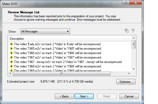 As per suggestions here - I then went into DVDA properties and changed disc type to DVD .... again the prepare step brings up warnings windows ... which is what I posted in #42 every video & audio track had to be re-compressed.