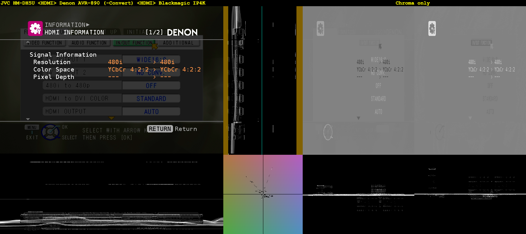 The C027 and IP4K captures of the 480i 4:2:2 Menu + Info screen are bit-identical (confirmed by SHA-1 hash of direct PNG screengrabs).