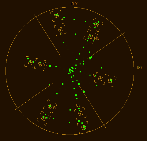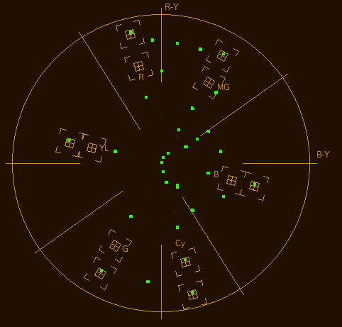 So, in summary, below are the vectorscopes of the SMPTE color bars: