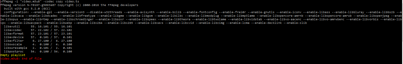 but it stops in about 50%. What i did wrong? I know livestreamer download full video, but i wanna do this with ffmpeg, please help.