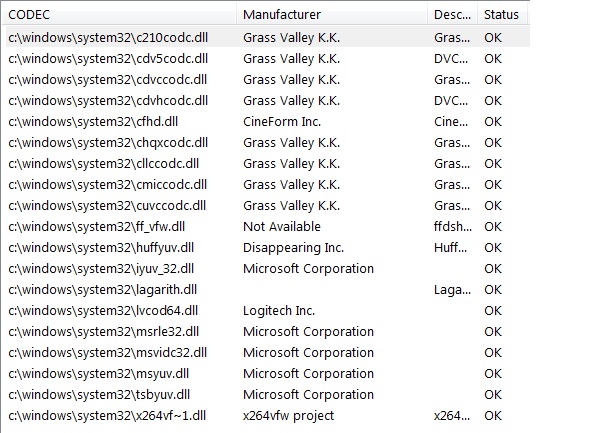 Here is attached list of codecs from NIRSOFT report for my PC ..... seems to show all codecs are present.