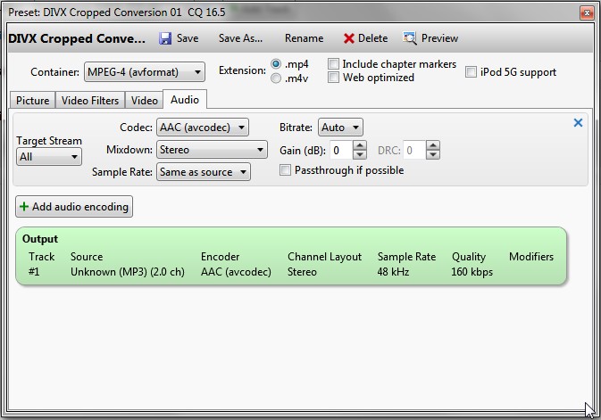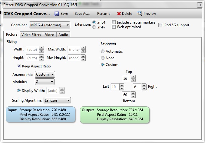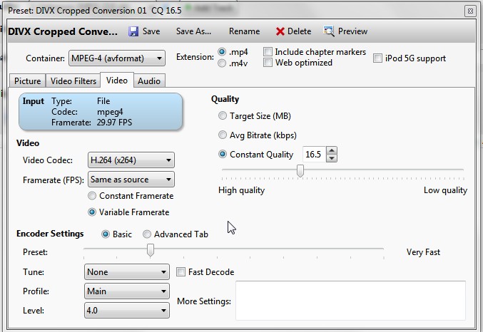 I have a lot of videos that I captured in .mpeg2 and then converted to .divx Well anyway I was experimenting with Vidcoder to figure out how to crop the 16:9 videos that are in a 4:3 framework. I set my quality setting at 16.5 and after the cropping and encoding the videos on a good quality TV look nearly as good as the originals. I will be back with some screenshots of the specs for this video preset. I also was able to figure out how to crop a SD show that is 16:9 but is surrounded by borders on all sides. Some channels are just SD and there are times that weather disrupts the HD channels so much you must work with the SD channels that are more reliable but granted are still not immune to swaying treetops or rain fade.