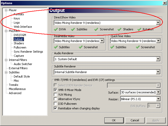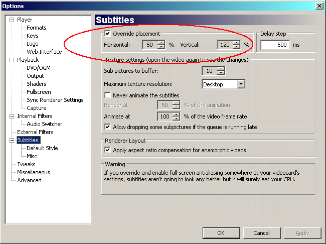 As far as moving the subtitles down, is the MPC-HC Output page set exactly as it is in my earlier screenshot? That's how I have it set and that configuration should work, but if you're using a newer version of Windows than XP you could also try changing the renderer at the top to Enhanced Video Renderer (custom presenter). It shouldn't matter though, but restart the player after changing renderers.