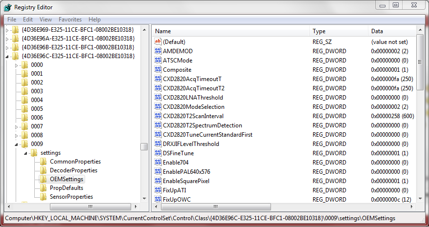 3. Under this key are a bunch of numbered subkeys. Expand any that have their own subkeys. You're looking for one that contains settings\OEMSettings. Hopefully you only have one of these entries, as narrowing down individual device installations is a bit more complicated.